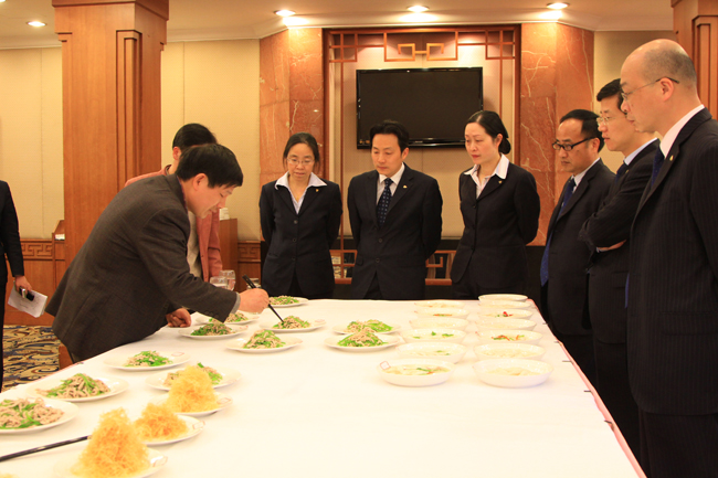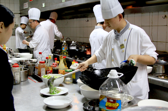 近日,饭店在餐饮部举行了一次厨房厨师技艺大比武,来自三大厨房的36名厨师参加了这次比武活动,同时邀请了市旅游职业学校的两名老师组成评分组对最终结果进行评定,饭店中层以上管理人员参与了现场监督。