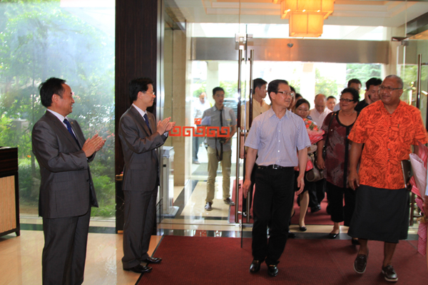 6月9日,斐济总理姆拜尼马拉马(左一)及夫人一行前来我市参观访问,副市长徐明光在总套会见厅亲切会见了姆拜尼马拉马及夫人一行。随同姆拜尼马拉马总理来访的有斐济驻华大使艾萨拉•泰莱尼,斐济驻华使馆参赞莱维尼•乃乌米等。